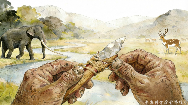 西沟装柄石器制作(倚靠式)复原图 (袁崇皓绘) 图片来源: 中国科学院古脊椎动物与古人类研究所