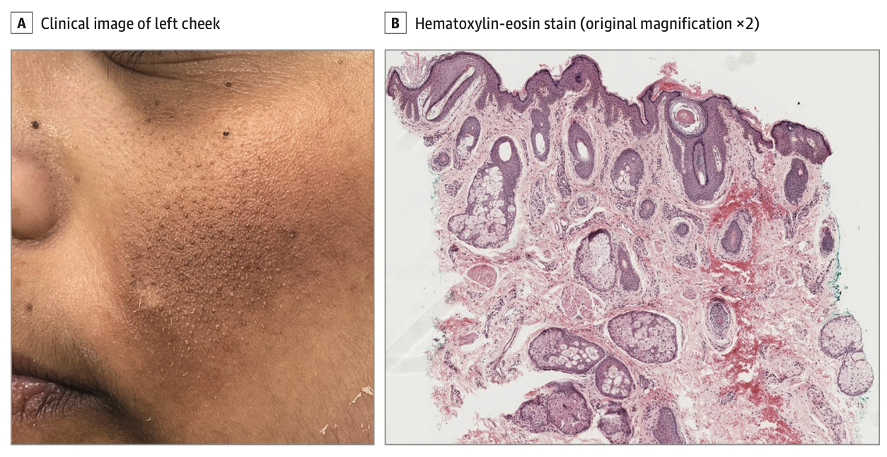 A:临床表现为肤色丘疹群集,伴局部色素沉着。B:钻取活检显示漏斗部扩张,真皮乳头层内可见杂乱 分布的小毛囊结构,以及毛囊角化过度。 图片来源:科普中国