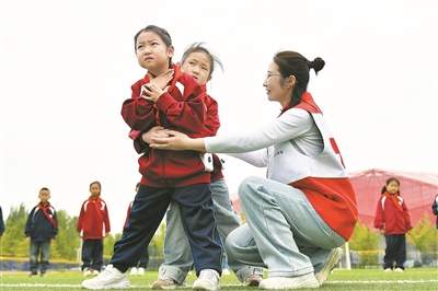 红十字志愿者在指导学生练习海姆立克急救法。(孙文潭摄) 图片来源:新华社
