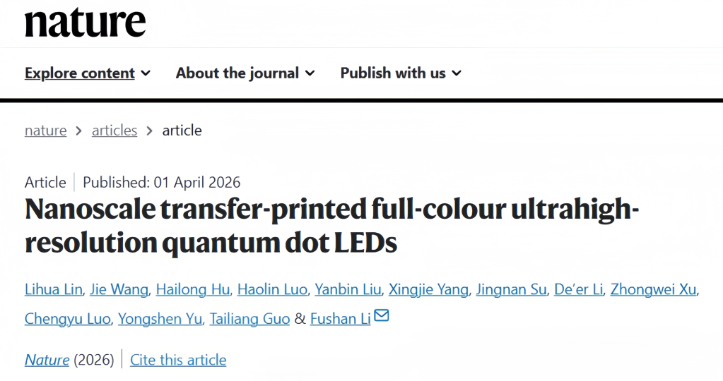2026年4月2日,福州大学李福山教授团队在超高清集成显示领域取得重大突破,相关成果发表于国际顶级期刊《自然》。当前AR、VR技术快速发展,行业正朝着更高清、更逼真、更耐用的方向升级,像素密度超万的“视网膜级”显示成为关键目标。但像素缩小到微米、纳米尺度后,传统工艺难以精准成型,还会出现色彩串扰、器件性能下降等问题,严重制约行业进步。为此,团队研发出全新纳米制造方法,能在极小尺度上对发光材料进行“精准印刷”,做出几乎无缺陷的红绿蓝三色像素阵列。通过优化材料排布与器件结构,既让发光更均匀稳定,又避免颜色互相干扰,同时借助纳米材料调控电流分布,大幅提升效率与寿命。实验数据显示,红光器件效率达26.1%,寿命超6万小时,绿光与蓝光性能也显著提升。团队还将该技术与芯片电路结合,做出可逐点控像素的集成显示样机,成功实现动态画面显示,为高端显示芯片发展开辟了新路径。