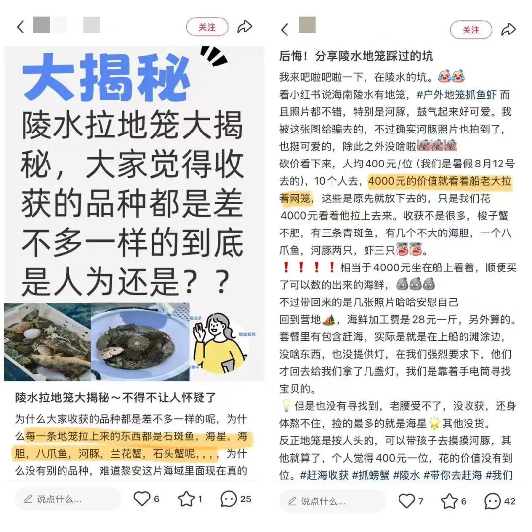 还有的体验帖吐槽说,围网、地笼里的海鲜捞上的时候已经死掉了。这可能是因为它们在运输和投放过程中经历了缺氧,或水温、盐度突然变化。更严重的是,围网和地笼在许多地方都是禁用渔具,使用这些工具作为赶海的商业模式,会对海洋环境造成破坏。