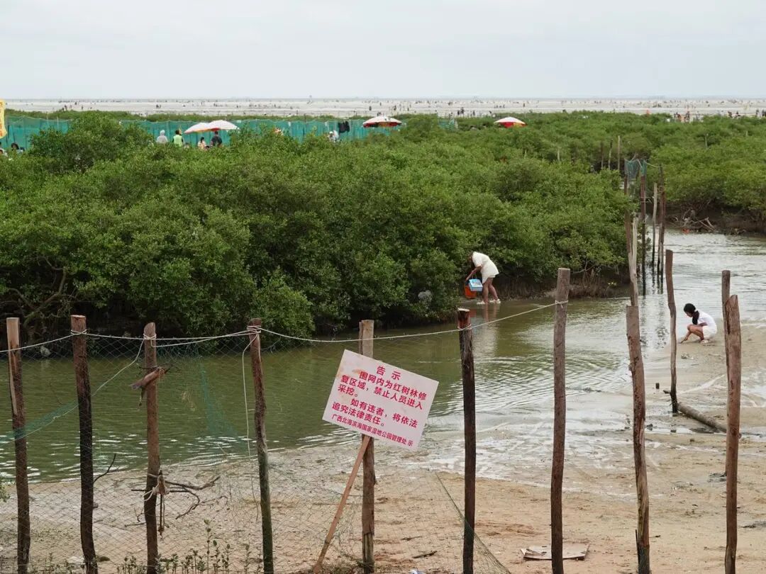 滩涂区域生物多样性资源丰富,旅游沙滩和渔村附近往往也分布着生态公园、保护区。一些游客会无视各种标志和限制,进入保护区域赶海。例如在北海,有不少游客进入红树林修复区域,造成的踩踏会伤害生长中的红树呼吸根。