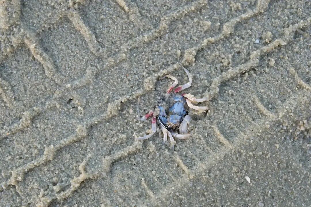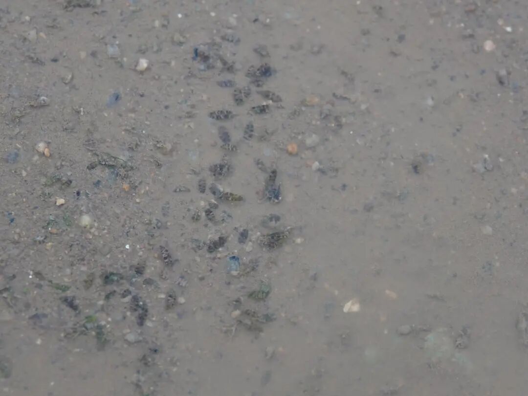 游客和司机承受了安全风险,海洋生物也遭了殃。滩涂上的车辙里,可以看到被轧死的螃蟹、鲎等海洋生物。长期的摩托车碾压还会导致滩涂变得坚硬不透气,影响滩涂的生态健康。