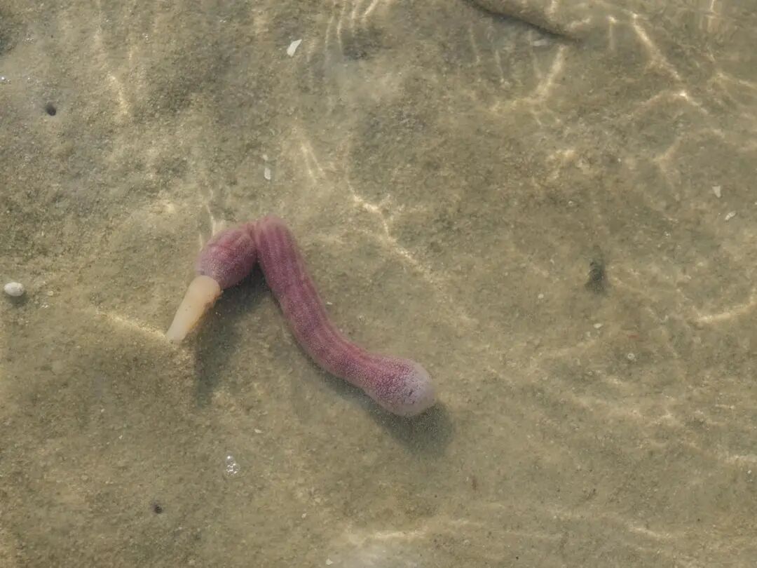 上:绛体管口螠通常埋在沙子里,把吻部伸出来滤食;下:绛体管口螠本体 | 玛雅蓝