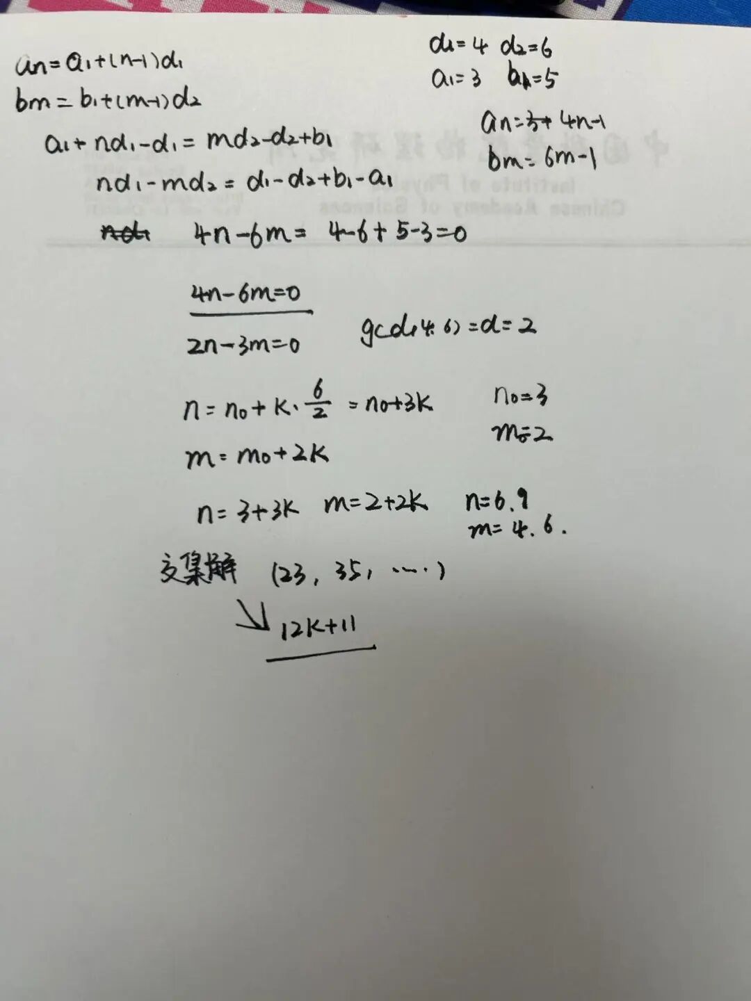 另一个等差数列可以表示为:之后我们开始解方程:经过复杂的求解我们解得,其中, 我们假设,的最大公约数能整除,然后假设, 那么方程的通解就是将通解代入原数列表达式,得到交集中的数:若 不整除 ,则交集为空集。