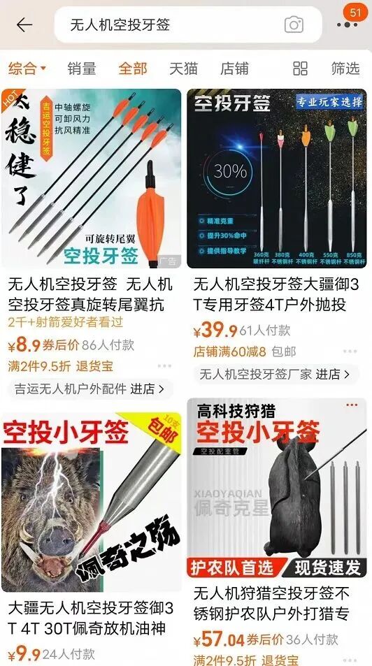 而与此同时则是实行无人机坠箭猎杀的装备,在网上随意流通,几乎没有限制。淘宝上随手一搜“无人机 坠箭”,“无人机 杀野猪”,这样具有巨大破坏力,甚至可以称之为“武器”的工具唾手可得,而且售价相对不高。卖家甚至都“懒得”像出售圈套等非法猎具一样,用个“暗语”。