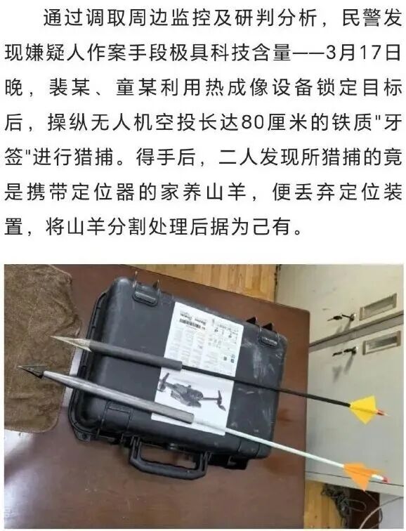 一根钢钎能准确地丢下来打穿野猪的头,那它就能打穿其他动物的头。4月18日赫山公安报道,有人使用热成像设备和无人机坠箭打死了养殖户的山羊,“得手后,二人发现所猎捕的竟是携带定位器的家养山羊”。这里的用词特别值得揣摩:“竟是”?那么他们本来准备猎捕的是什么?