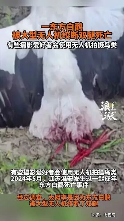 去年5月,江苏淮安有人用无人机违规航拍,螺旋桨绞断一只东方白鹳(国家一级保护动物)的双腿致其死亡。