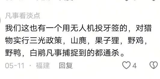 无人机坠箭可以杀野猪、家畜,也就可以杀死大熊猫、藏羚羊、东北虎……当然,无论使用什么工具,捕杀保护动物,或在禁猎区、禁猎期打猎都是违法的。但盗猎本身就极具隐蔽性,很多案件的线索都出现于销售端,而一旦动物成了“货物”,对于生态保护来说往往意味着“为时已晚”。原本的电网、兽夹、猎套已经让盗猎防不胜防了,如今再增加一种革命级的、买卖完全无限制狩猎工具,绝不会是什么好事。