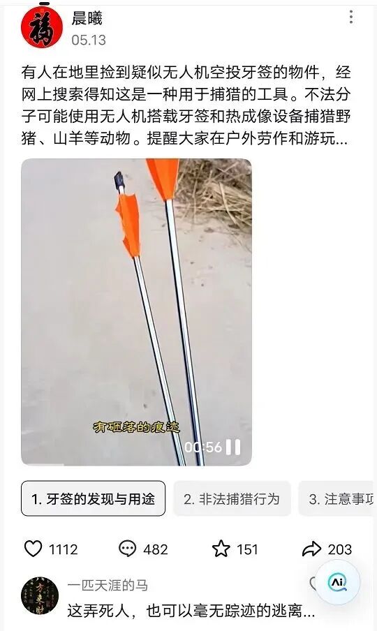 首先,犯罪嫌疑人非法猎捕野生动物的手段之一是无人机坠箭,这是一种大多数人闻所未闻,但在国内狩猎“圈子”里已经相当出名的狩猎方法,黑话称为“牙签”。用无人机红外热成像找到动物,然后扔下钢箭,利用重力加速度把动物刺死。