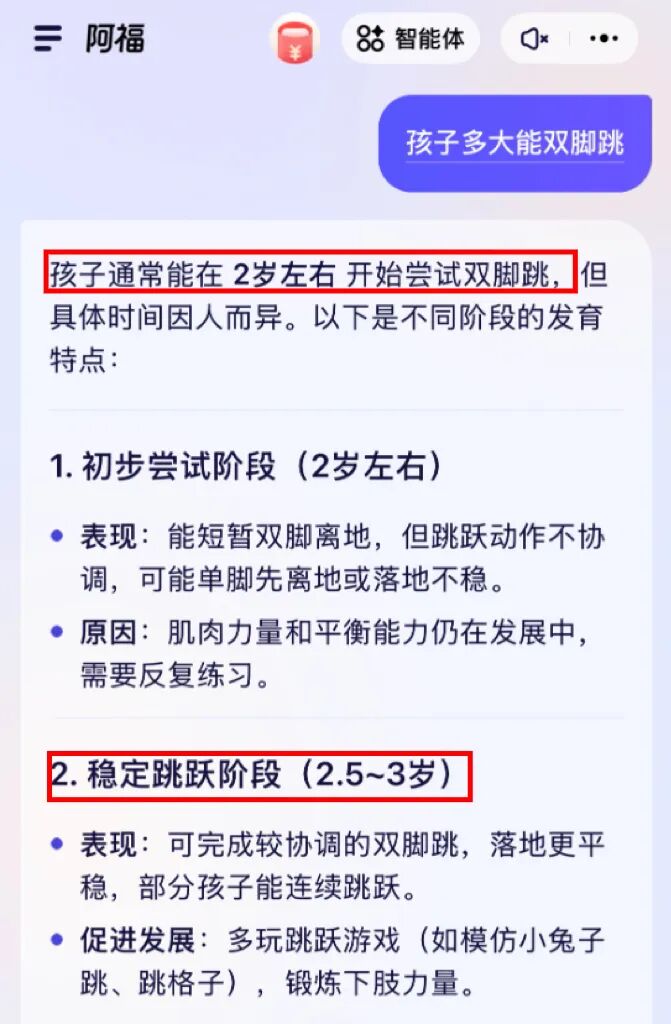 除了睡眠的问题,我们还测试了「孩子多大能双脚跳」「孩子多大能吃盐」,答案内容都和我们的观点高度一致。