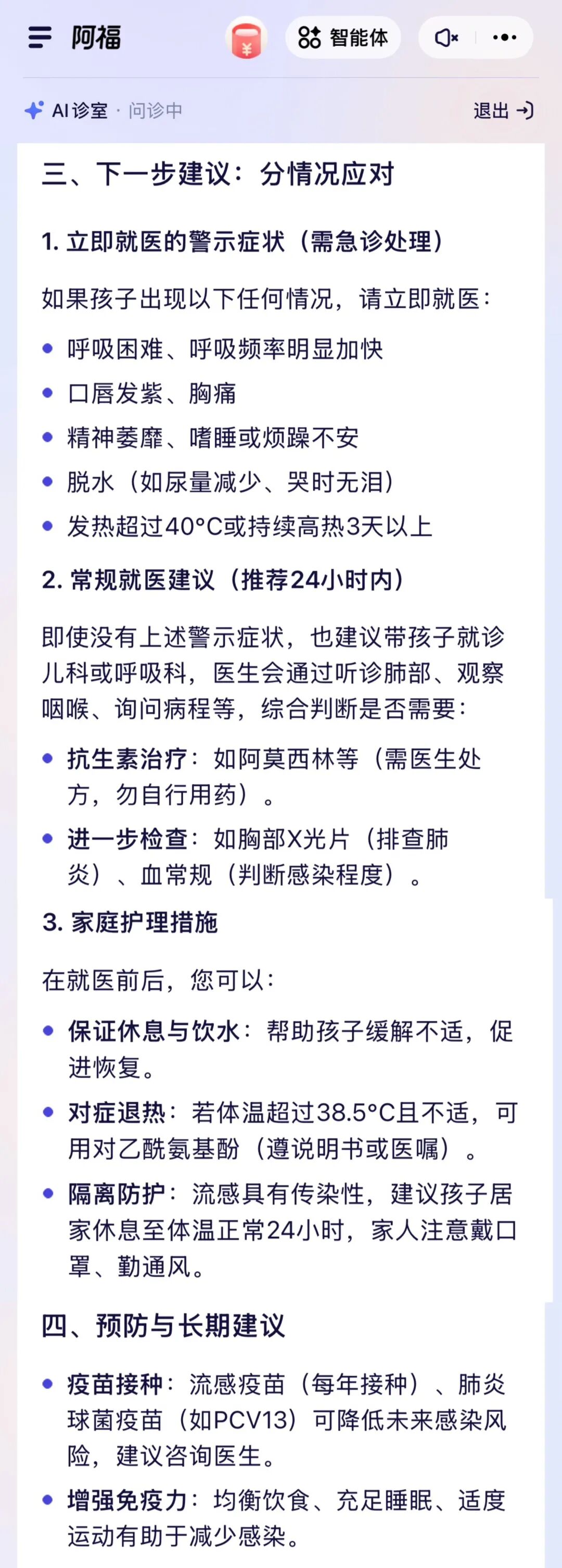 最后,阿福不仅贴心地给了立即就医的提醒,也给到了居家护理建议,家庭内部做好防护、及时接种流感疫苗,非常详细。