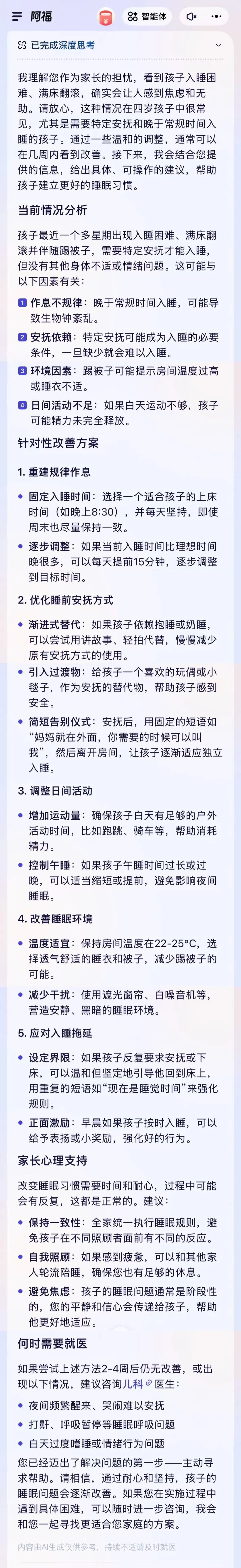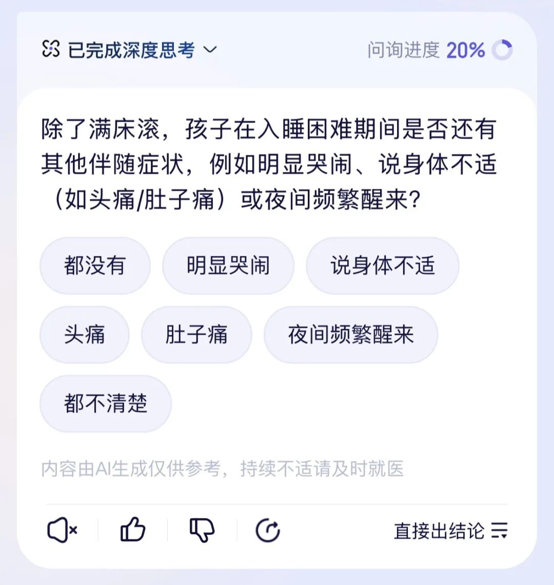 它先简单概括了问题可能存在的情况,提出更多细节的「追问」:从睡眠是否有变化、有没有生病情况、睡前吃了啥、午睡情况等等一共问了 7 个问题。