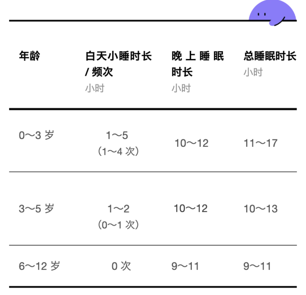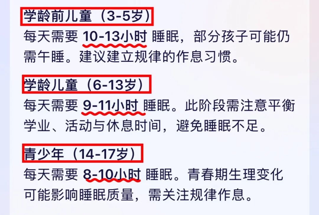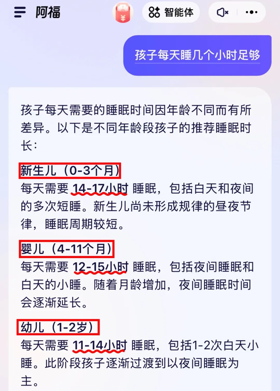 阿福不仅详细给到不同孩子年龄段的推荐睡眠时长,还做了明确区分,一目了然。