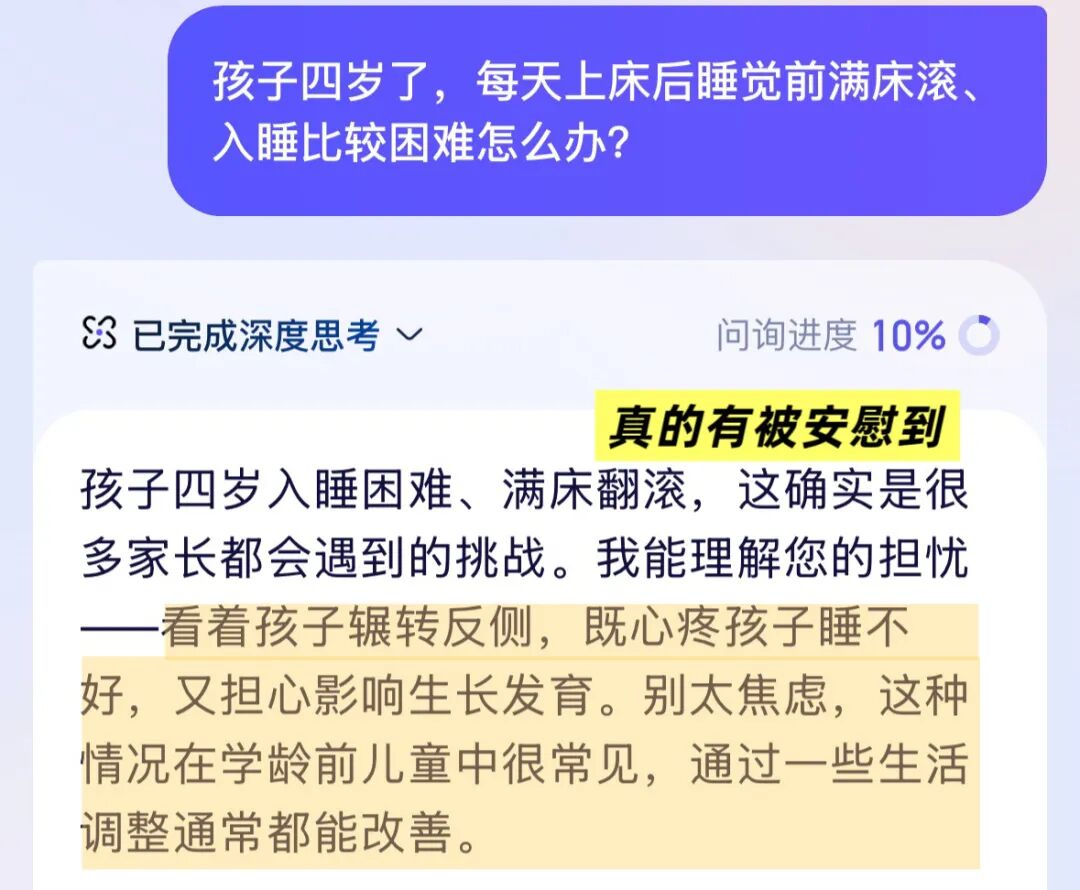 相比于其它你说啥就会回答啥的傻瓜 AI,阿福更是像一个有温度的「人」,这些宽慰的话,真的很挺暖心,能安慰到深夜哄睡的老母亲 😭