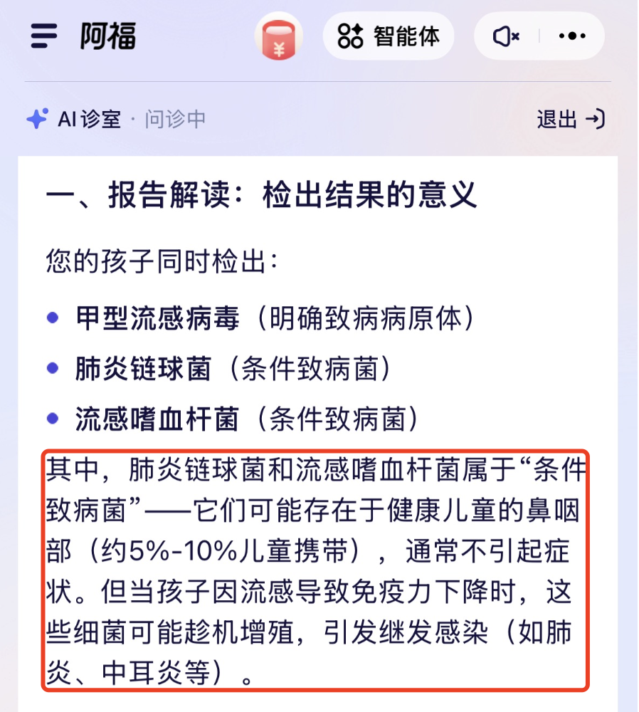 紧接着,它解释得明明白白:肺炎链球菌和流感嗜血杆菌都属于「条件致病菌」,健康孩子体内也可能存在,平时不致病,但要提防甲流会联合感染,看完就让人安心了不少。