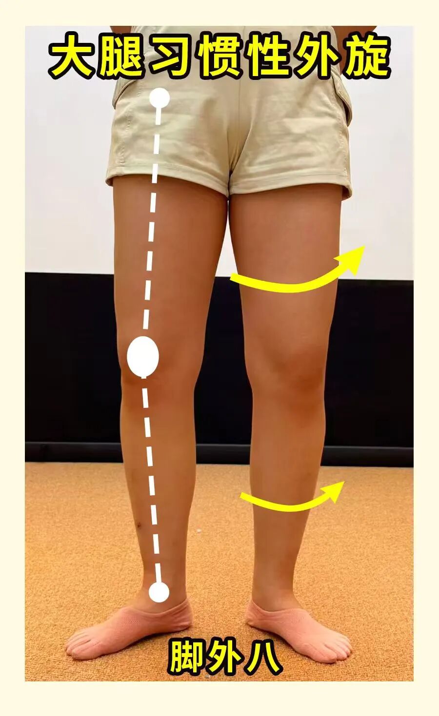 站立时可以稍微留心一下:如果明显外八或者感觉控制不住大腿总往外撇,往往意味着髋内旋控制不好、臀中肌也是偏弱的;这就导致了身体只好用大腿外侧肌肉发力代偿来维持稳定。