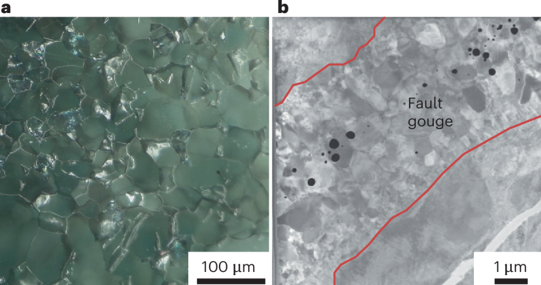 瓦兹利石和断层橄榄石 a.在 14 GPa 压力和 1,400 ºC 温度下合成的瓦兹利石的光学显微镜图像。b.在 15.5 GPa 和 830 ºC 下变形的多晶橄榄石中形成的断层泥层的扫描透射电子显微镜图像,该层填充有橄榄石和瓦兹利石的纳米颗粒。