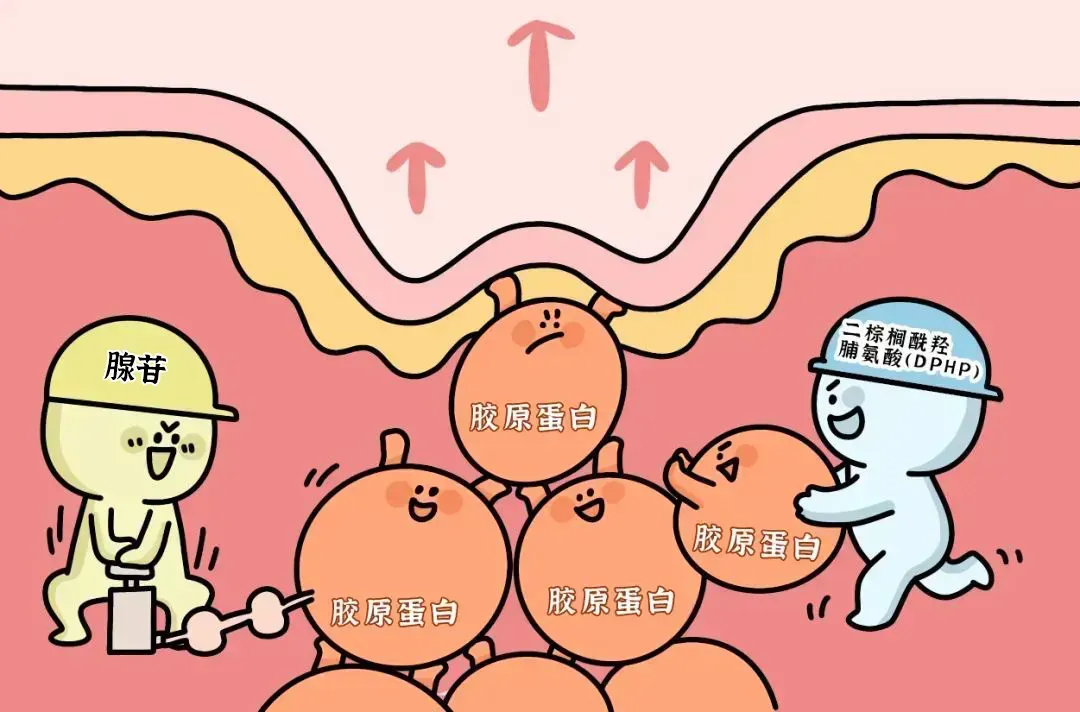 里面发挥作用的,其实是腺苷、二棕榈酰羟脯氨酸,以及以乙酰基六肽- 8 为首的多肽天团(棕榈酰五肽 - 4、棕榈酰三肽 -1、棕榈酰四肽 - 7)。